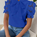 Bluza aceasta defemeise remarcă prin designul său fin și detaliul decorativ cu fundă la guler. Mânecile din plasă delicată aduc un plus de lejeritate și rafinament. Materialul moale garantează confort pe întreaga zi. Se potrivește ușor cu pantaloni, fuste sau pantaloni scurți pentru un look elegant. Potrivită pentru birou, momente de relaxare sau evenimente speciale.