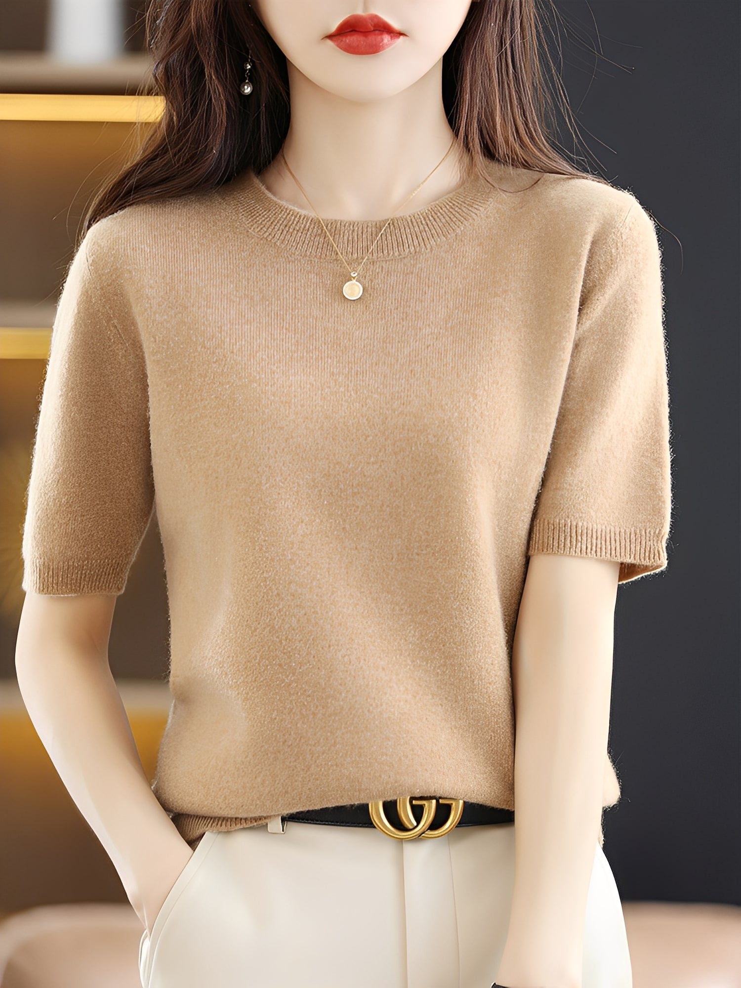 - Mâneci scurte — perfect pentru a fi purtat singur sau sub alte piese în sezoanele de tranziție.
