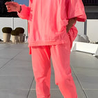 Setul Eleanore combină un tricou cu croială largă cu pantaloni asortați pentru un look relaxat, dar stilat. Realizat din material moale și de calitate superioară, oferă confort pe toată durata zilei. Setul poate fi purtat fie separat, fie împreună și este ideal pentru activitățile zilnice, timpul liber sau momentele de relaxare. Perfect pentru femeile care doresc o combinație de stil și confort.