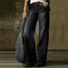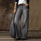 Piciorul larg și talia înaltă creează un stil retro elegant