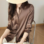 Îmbunătățiți-vă garderoba cu bluza noastră din satin cu mâneci lungi și nasturi, unde eleganța întâlnește confortul zilnic.